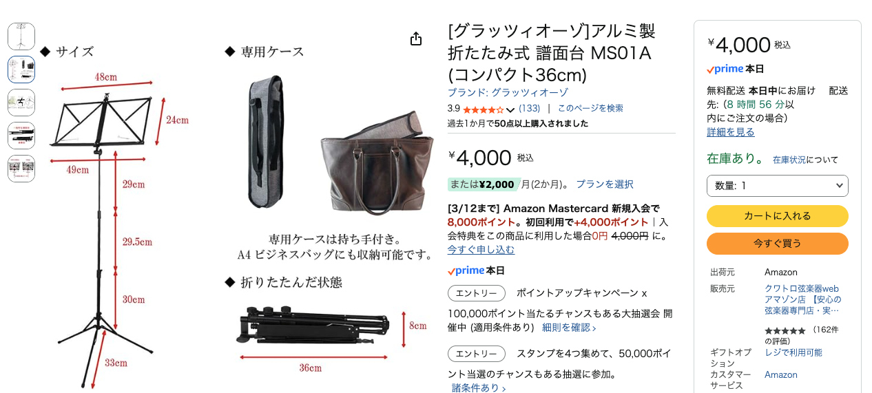 グラッツィオーゾ アルミ製 折たたみ式 譜面台 MS01A