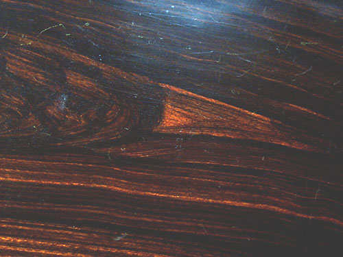 ● また、19世紀の一時期は松にツキ板を貼った上からさらにハカランダの木目を手書きするといったことも行われていたとのことです。19世紀後半にドイツ(あるいはフランス)で見られた手法らしいのですが....。一見して判別できるものもありますが、見分けるのが困難なものもあります。やたらはっきりとした木目とかを見かけたらじっくり観察してみてください、すごい職人芸?だったりします、アメリカやドイツの古いギターでも私は実物の塗装を見たことがあります......。一方では20世紀に入ってプリント合板を使ったものがあるらしいのですが、オークションなどでごくまれに見たことがあるもののこちらについては私は詳細を存じません。