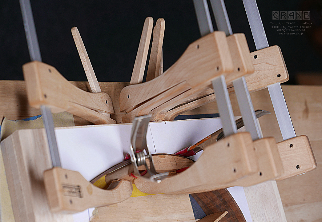 表面板のブレイシングを終えて横板へニカワで接着