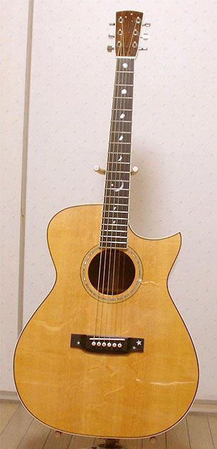 う〜〜〜む、これまたスバラシイ仕上がり。こだわりの材料とスタイルに並々ならぬものを感じます。ポジションマークの月星のインレイも魅力的です。ヘッド、ブリッジ、パーフリングに至るまでオリジナリティを感じます、自作楽器の醍醐味とアマチュア製作家の底力がビンビン伝わってくる1本です。大西さんはこれで6作目(オリジナルは第1号)のギターということで、今までのマーチンキットがきっと良い経験になったのでしょうね。私もアコギを作るときはヘッドにインレイをいんれいてみよう! こりゃ〜〜目に毒です、作りたくてウズウズしてきます.......。