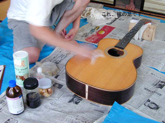 マーチンのキットはいろんな方々が製作されていますが、マーチンの音を再現するのはたいへんでしょうね(それこそが楽しみでもあります)。さぞ天野さんは入念に製作され、その成果がちゃんと作品に反映されていると察しまする。気に入った音が得られるというのはこのうえなくシアワセなことですよね。私も現在 Martin の O(シングル・オー)タイプを製作していますが、スチール弦ならやはりマーチンはアコギファンにとってひとつの理想の音ですもんね。OM はウエストのくびれ具合井が微妙な味わいでこのモデルのこの音のファンも多いようですが、いずれ私もこういった大きめのギターも作ってみようかと思います。トップはスプルースで板厚 3.0mmとはけっこう厚いんですね。糸巻きはWaverly! アバロンラミネートのピックガードがまばゆいっ! 写真から拝見しまするに、全体的に製作の工夫が見られ、アイディアにもコダワリを感じます。奥様のおみ足も特別出演ということでありがとうございます(笑)。