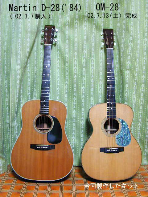 Web上で発注したMARTINキット、OM-28です。発注から5週間後に到着し、開梱してみてガックリ!! なんと、あるはずのヘッド裏のダイアモンド・ボリュートが無い。 これじゃー、OM-18と見間違えられるやんか、と思いながら、気落ちしたまま、6/1(土)に製作に取りかかりました。そして7/13(土)に完成。 気が付いたら、もう、ボリュートのことなんかどうでもええや、という感じでした。ところで、今回のマーチンキット製作のアドバイスをいただきました皆様に、鶴田さまのHPをお借りしまして、厚くお礼を申し上げます。ありがとうございました。
