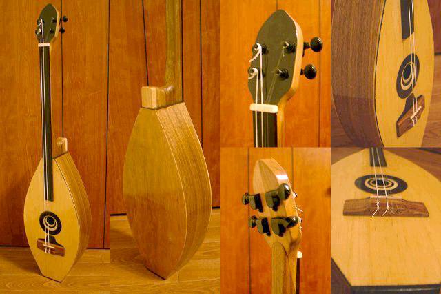 民族楽器系の香りがプンプンして、しかしながらモダン! 創作意欲がみなぎっている力作ですね。4弦2コースというのが大胆で思い切りがあって素晴らしいと思います。舟形ボディにバルサ材トップ、ブレイシングも「ハ」型二段、フレットレス、おまけに直立自立というコダワリのカタマリです。サウンドホールは窪みで朝顔状というかラッパ状になっているのでしょうか(ベルボトムといふべきかな?)。