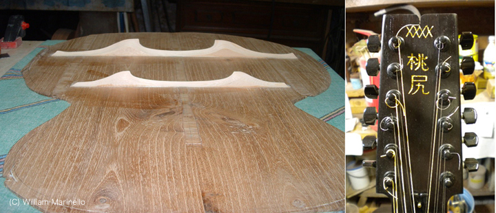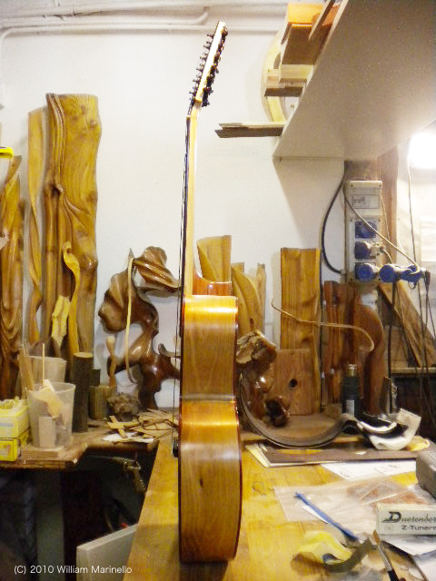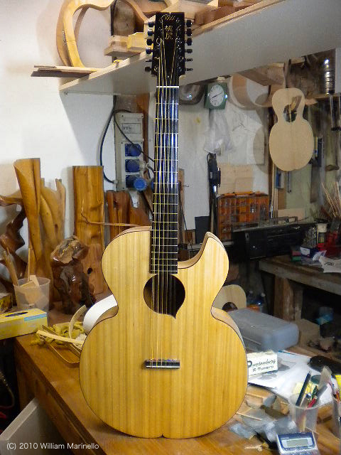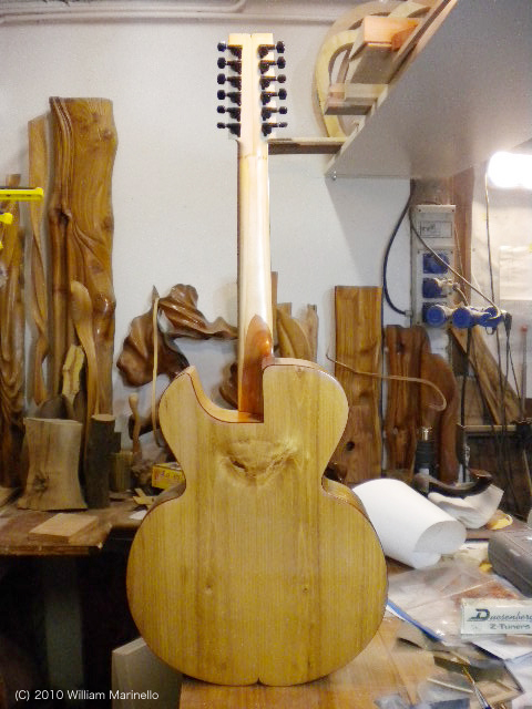 ヴェネツィアで建築や修復の仕事を営むかたわら、ギター作りに没頭しているというウィリアム・マリネッロさん。日本人の奥様からメールをいただきました、「主人はもともと木が大好きで、ずっと木で色々な彫刻のオブジェを作っていましたが、ギター製作に出逢ってからは、それに没頭しています。目の焦点があってないなあ、と思うとだいたい次のギターの事を考えている有様... 」とか。ウン、ウン、わかる、わかる。私だって気がつけば遠くを見ながら次に作るギターのコト考えてるもん。