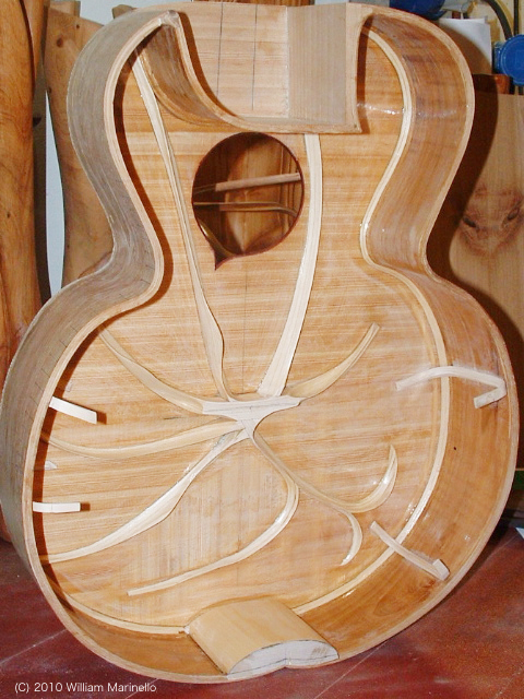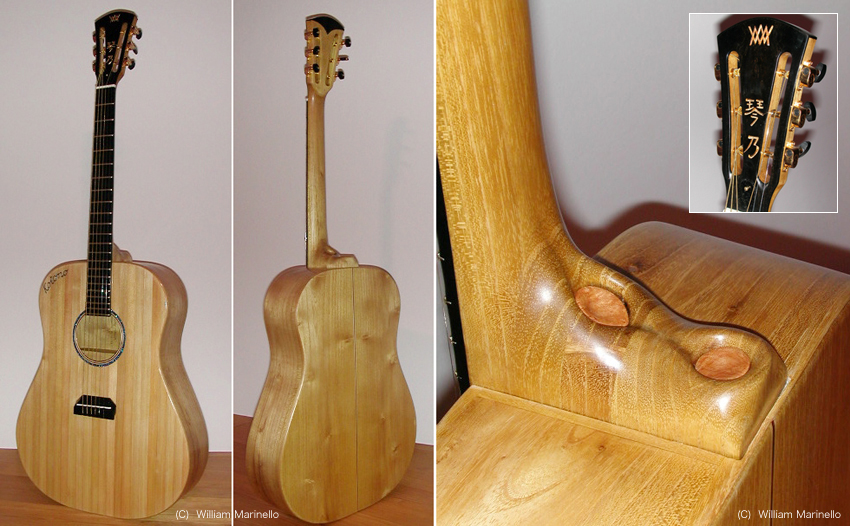 それにしても、なんて独創的なんでしょう。自在に掘り出されたブレイシングはまるで樹木の幹や根が伸び育つ様にも見えます。様々な箇所に彫刻作品をイメージさせるものがあります。 「桃尻」、なるほど確かにこのギターのフォルム、西洋人ではなく日本人だなぁ。 ウエスト部分は曲げるのがたいへんだったでしょう。 エンドブロックもちゃんと桃のカタチに2つに分かれていますし、 どこからみてもちゃんと桃(オシリ)のカタチですね。使われている材料や音にかかわる構造など、あらゆるところに マリネッロさんのこだわりが出ている傑作。一度見たら二度と忘れないキョ〜レツなギターだと思います。