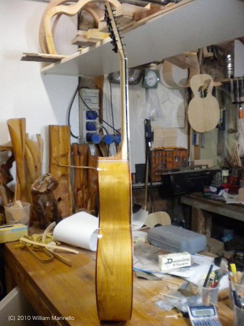 表面板はカラマツの薄板を重ねたもので、厚みは、1.5mmから3.5mm。トップに薄板を重ねる方法は、(アルベルトの反対にもかかわらず)1作目のギターと同様です。実験的な意味で行いましたが、余りにも時間を取り過ぎたのでこれが最後になるでしょう。結果として音色は甘くバランスがとれ、リッチなハーモニーで‥‥ ええ、ええ、もちろん、これは作った私本人の感想でして、でも、めずらしく今のところ出来に満足しているのです。