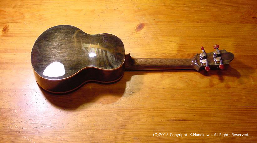 さて、楽器として一番大切な音。とてもキラキラした、クリーンな音なのはびっくりしました。ウクレレとしての柔らかさより、ギター系のサウンドのようです。フロロカーボン弦の影響もあるかもしれません。 この製作によって、デザイァ、音、演奏性が確認できたので、次回作は、メープル&ウォールナッツを製作中です。