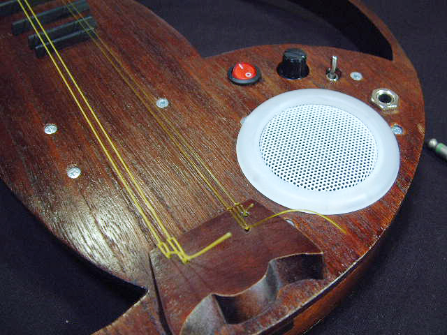 弦は三味線のテトロンとナイロン,4弦2コース,オリジナルの清楽月琴より 2本多い10フレットで,4C/4Gのチューニング時2オクターブ(半音ナ シ)の音域が出せます。 前作カメ1号は圧電素子のPUをジャックにつないだだけのシロモノでしたが、今回は,アキバで買った¥700のパワーアンプのキットと,百均で買ったミニ スピーカーをバラしたのを仕込んで,世界初(かどうかは知らない)のアンプ内蔵型エレキ月琴といたしました!