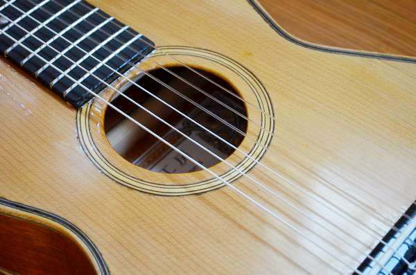 現代ギターの5フレットにカポタストを取り付けた音程にしています。弦長さが2/3で音程が4/3ですから張力は(2/3)÷(3/4)=0.89となり、子供の力でも押さえ易くしています。弦は1〜3番のナイロン弦をEXCELLENCE CECILLIA ロ−S 4〜6番はプロアルテのノーマルテンションシルバーです。