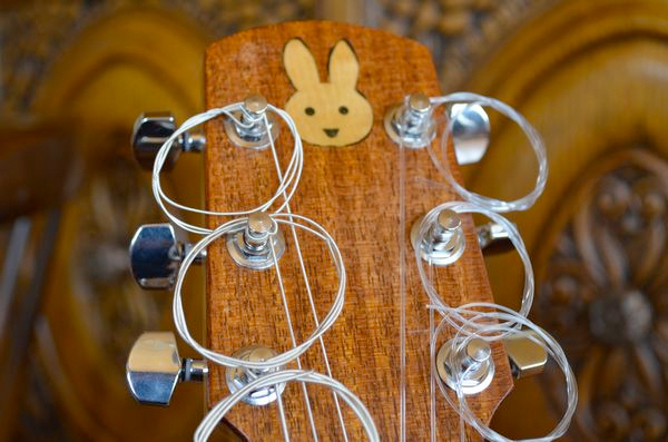 ヘッドにはウサギの顔をメープルのバーズアイで象嵌しました。お洋服などにウサギの模様を好んでいるので「ウサギの象嵌」にしました。