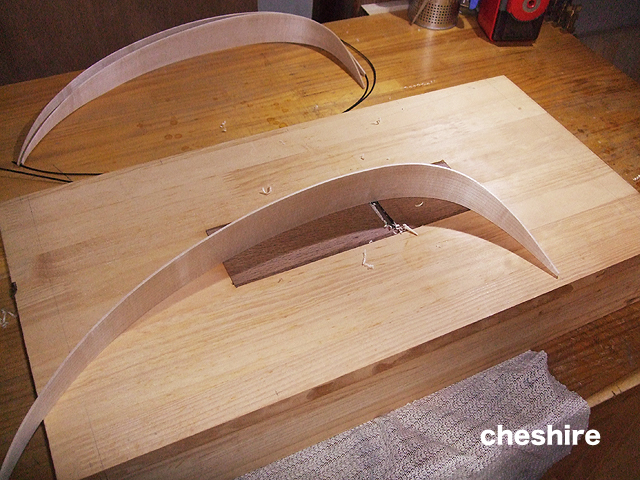 図面を分析して、しっかり木型を組んで補正・調整しながら作ってあるので全体のフォルムが整っています。専用のリブカンナ台やクランプを自作するなど、作業段階ごとに慎重に作業された様子がうかがえます。リブ組みの黒いバンドはタイヤのチューブでしょうか。ゴーバークランプ台には「竹」の押さえ棒です。過去の製作の経験も活かされています。