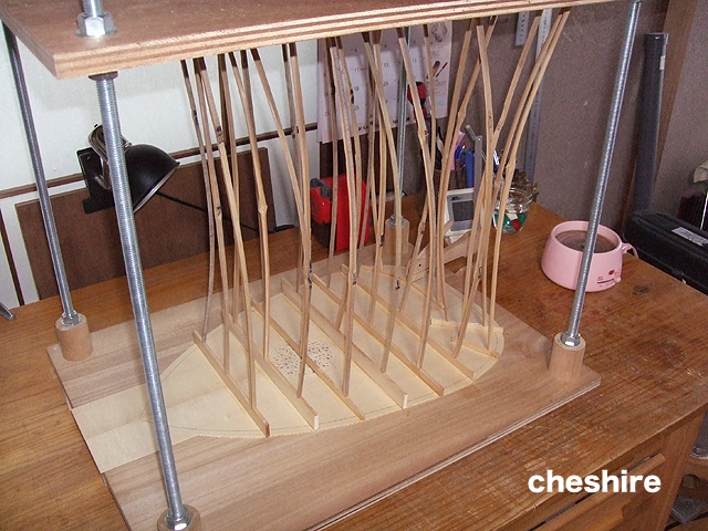 ・写真5:力木接着。以前はカムクランプでしたが,効率が悪いのでゴーバーデッキを作りました。ゴーバーは竹です。