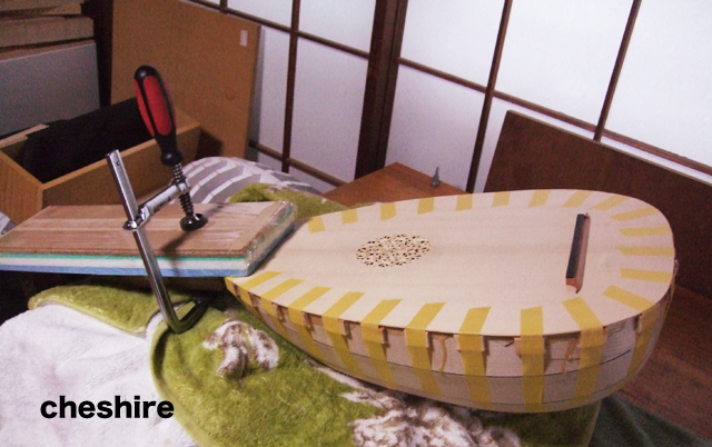 ・写真10:表面板の接着。接着の当てものには,子供が昔使ってたビート板(水泳の)を活用。