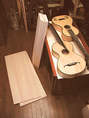 とうわけで目標がはっきりすればあとはおおまかな構造をスケッチしておき、寸法を確定します。スケッチもいくつか描いたのですが今回は掲載しません(キタナイので)。私の場合、市販されている木材の寸法にもケース形状は左右されます。今回は幅45cmのファルカタ集成材を使います。厚さは約1.5 cmです。当初は幅を41cmに考えていたのですが45cmに広げることでケース全長を短くできます。つまりなるべく木材カットの手間を省こうという手抜き作戦です。シュタウファスタイルのギターはヘッドが長いのでちょっと気をつかいますが逆に考えれば、これが納まるサイズであればたいていの19世紀ギターは格納できるのです。