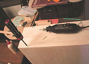 接着は木ネジを併用しながらタイトボンドで接着しますが前もってルーターで木ネジの下穴をあけておいたほうが良いでしょう。釘を使ってもかまわないと思います。昔のケースには釘は使わないのが一般的ではありますが....。ちなみに今回使用している木ネジやフック類のパーツはすべてブラス製です。フック類は探せばたいていのものはブラス製がみつかります。できるかぎり19世紀を意識したパーツを使うのが鉄則......と見せかけてじつはたまたまお店に揃っていただけのこと.........。木ネジは深さが30mm近くありますがあとでストラップを付ける強度を考えてのことです。