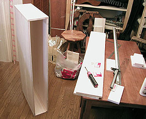 材料が揃ったら予備(パーツ)加工です。寸法を測りながらノコで切っていきますが、ファルカタ集成材はバルサ材より硬く重いですが、一般の工作用木材(ひのき等)よりははるかに軽くて丈夫で加工もカンタンなのでケースにはうってつけです。厚さは1cm程度にしようと思っていたところお店(三鷹のJマート...Jリーグみたいな名前のDI.Yショップ)には1.5mm厚しか置いてないとのこと.....まあ、なんとかこれでいきましょう。補強材をほとんど省ける厚さと考えればいいでしょう、前向きにまいります。悩んでいる時間はないのです。少なくとも3日間で完成させねばなりませんし....。
