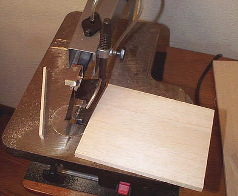 材料が揃ったら予備加工です。寸法を測りながらノコで切っていきますが、バルサ材はあまり厚くないものならカッターでも切断可能です。私は糸のこでサ〜〜〜〜〜ッと加工しちゃいます。