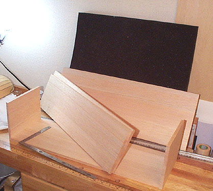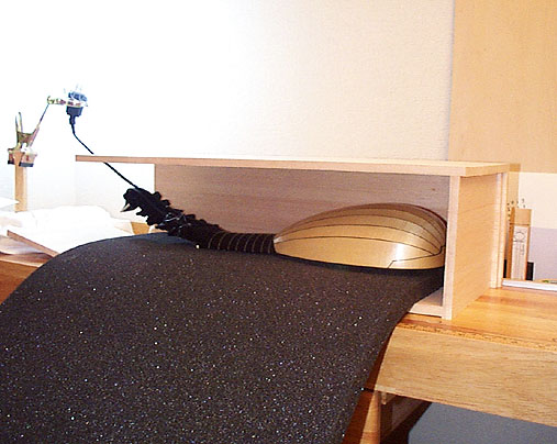 すでに寸法は測ってあっても実際の楽器を配置してみて、確認しながら作業をすすめれば失敗も少ないでしょう。これはウレタン・フォームの裁断の準備です。なんとか足りそう。