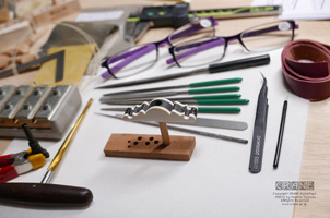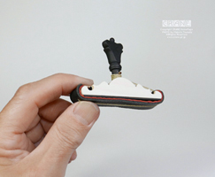 2017年でいったん完成したCRANEカポのシェイプですが、例えばモダンギター用の象牙や黒檀素材では20g前後になることが多いため、今回は贅肉をさらに落としています。また、モダンギターは60mmぐらいの幅広になるため中央の山を両脇へわずかにならし、かわりに触角を少し誇張しています。