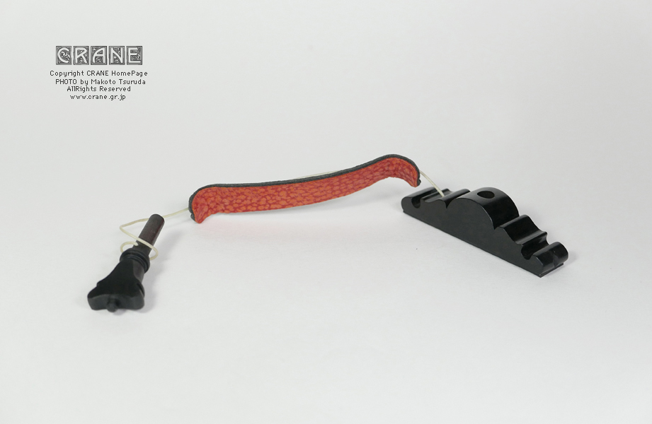 フリクションペグによる鶴田誠の手工品です。基本的に全て天然素材を使っており、プラスチックのたぐいは使用していません。革は革の専門工房のもので、ブランド品の高級バッグなどに使われている良質な皮革です。全体はスペインスタイルですが、鶴田の工房CRANEのオリジナルデザインで、1個づつ手作りしています。過去にいくつかカポを作って御希望の方にお譲りしてきましたが、基本的に同じものはありません。よく似たモデルであってもサイズや素材や装飾やシェイプ、塗装等が微妙に異なります(ソールのサイズによってもデザインを調整しています)。原則注文は受け付けていません(気分により応相談)。基本的にはワンオフの1点モノとなります。工房CRANEの正規品として焼印が刻印されています(モデルによってはデザインを損なわないよう底部に焼印を押しています)。