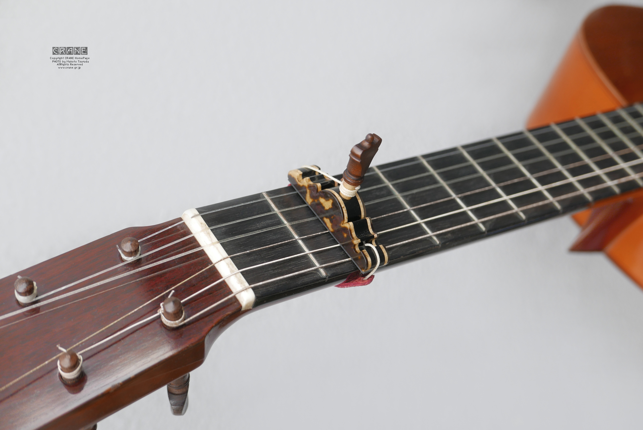 フリクションペグによる鶴田誠の手工品です。基本的に全て天然素材を使っており、プラスチックのたぐいは使用していません。ガットは羊腸を使い、革は専門工房のもので、ブランド品の高級バッグなどに使われている良質な皮革です。全体はスペインスタイルですが、鶴田の工房CRANEのオリジナルデザインで、1個づつ手作りしています。過去にいくつかカポを作って御希望の方にお譲りしてきましたが、基本的に同じものはありません。よく似たモデルであってもサイズや素材や装飾やシェイプ、塗装等が微妙に異なります(ソールのサイズによってもデザインを調整しています)。原則注文は受け付けていません(気分により応相談)。基本的にはワンオフの1点モノとなります。工房CRANEの正規品として焼印が刻印されています(モデルによってはデザインを損なわないよう底部に焼印を押しています)。