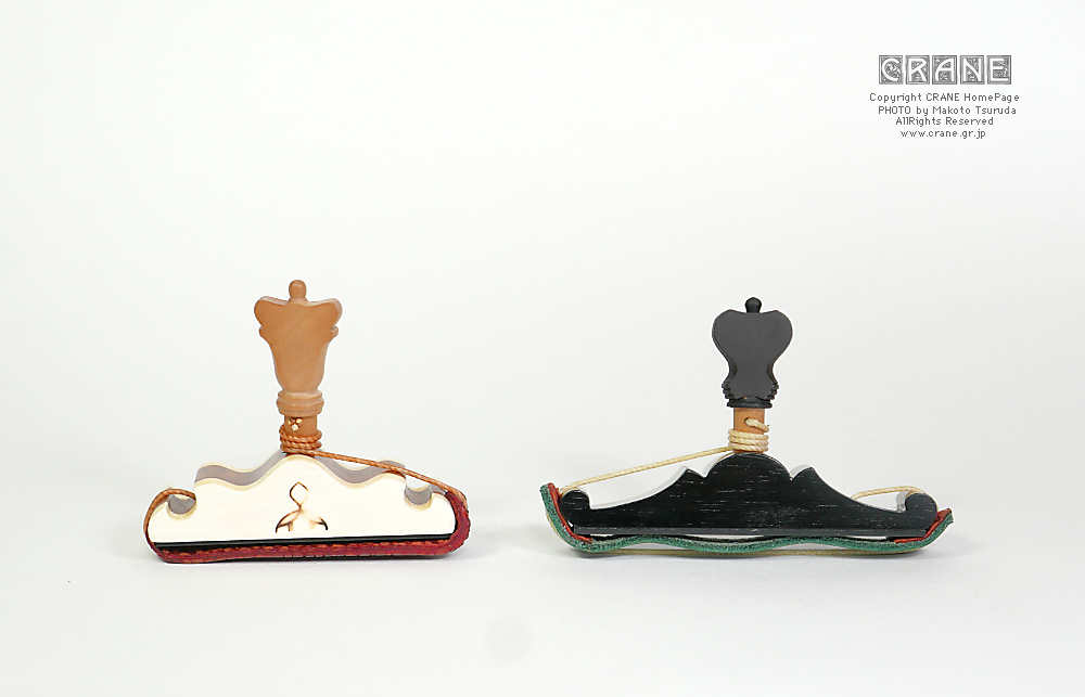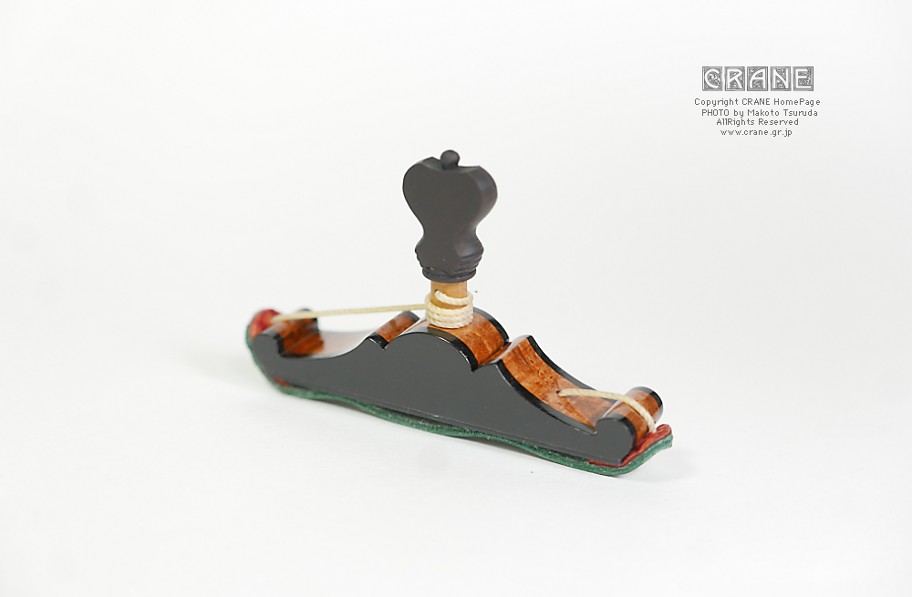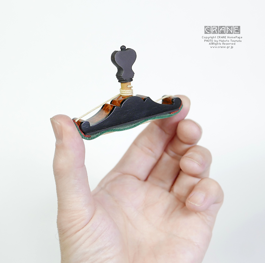 フリクションペグによる鶴田誠の手工品です。基本的に全て天然素材を使っており、プラスチックのたぐいは使用していません。ガットは羊腸を使い、革は専門工房のもので、ブランド品の高級バッグなどに使われている良質な皮革です。全体はスペインスタイルですが、鶴田の工房CRANEのオリジナルデザインで、1個づつ手作りしています。過去にいくつかカポを作って御希望の方にお譲りしてきましたが、基本的に同じものはありません。よく似たモデルであってもサイズや素材や装飾やシェイプ、塗装等が微妙に異なります(ソールのサイズによってもデザインを調整しています)。原則注文は受け付けていません(気分により応相談)。基本的にはワンオフの1点モノとなります。工房CRANEの正規品として焼印が刻印されています(モデルによってはデザインを損なわないよう底部に焼印を押しています)。