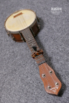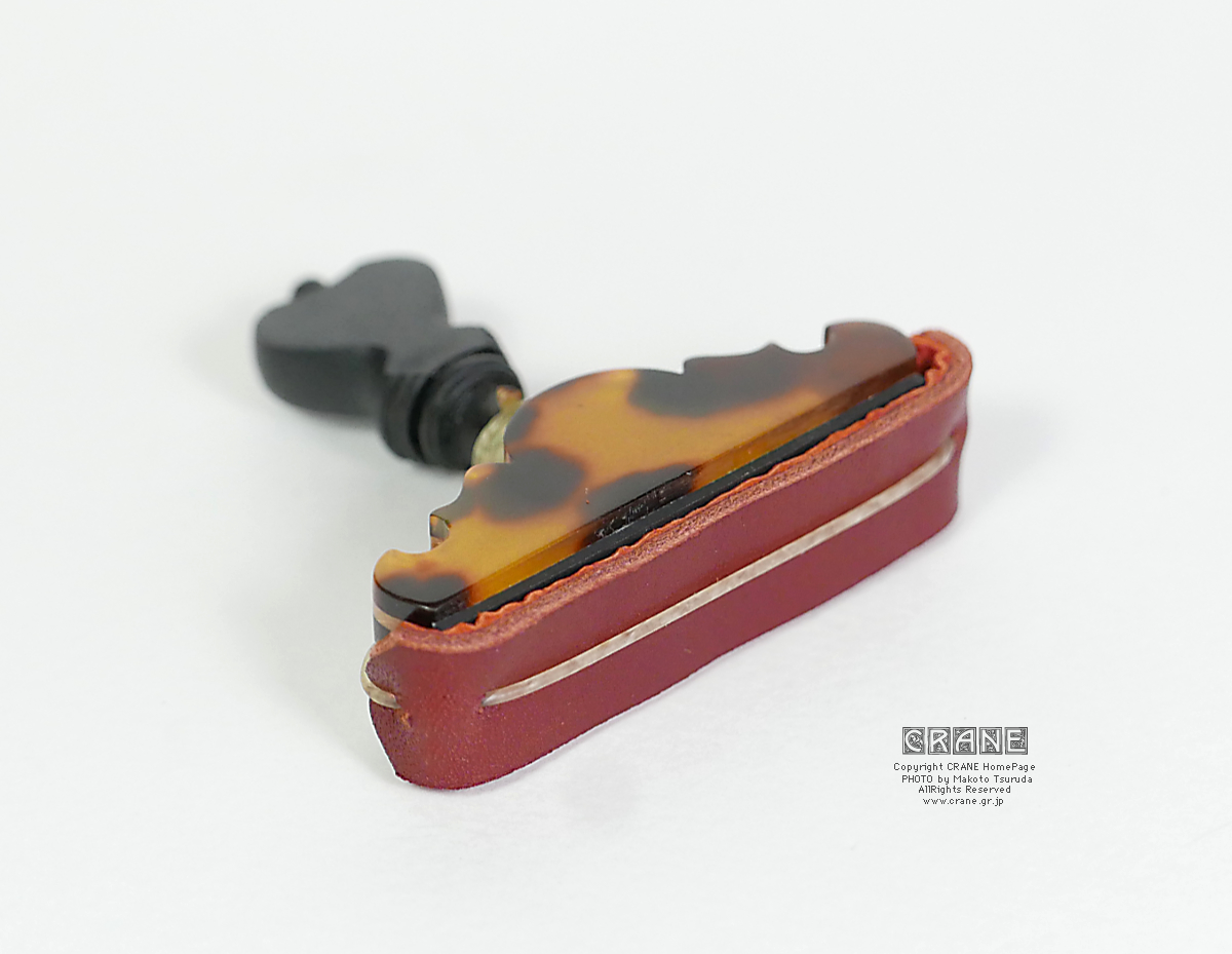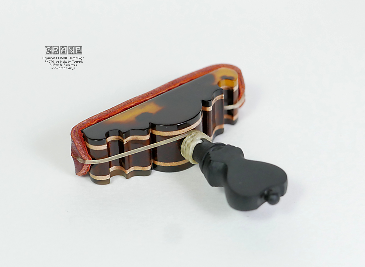 フリクションペグによる鶴田誠の手工品です。基本的に全て天然素材を使っており、プラスチックの類いは使用していません。ガットは羊腸を使い、革は専門工房のもので、ブランド品の高級バッグなどに使われている良質な皮革です。全体はスペインスタイルですが、鶴田の工房CRANEのオリジナルデザインで、1個づつ手作りしています。過去にいくつかカポを作って御希望の方にお譲りしてきましたが、基本的に同じものはありません。よく似たモデルであってもサイズや素材や装飾やシェイプ、塗装等が微妙に異なります(ソールのサイズによってもデザインを調整しています)。原則注文は受け付けていません(気分により応相談)。基本的にはワンオフの1点モノとなります。工房CRANEの正規品として焼印が刻印されています(モデルによってはデザインを損なわないよう底部に焼印を押しています)。