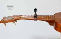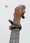 ウクレレ用に製作した木製カポタストです。ソプラノ、コンサート用ですがテナーは指板幅にもよります。フラット指板用なのでラウンド指板には使えません。声の高さ調整に使う場合は3カポ(3フレット)ぐらいまでを想定していますが、この写真のようにハイポジションで前後2つのフレットの下駄の上にセットしてもちゃんと機能します。写真はクマラエのソプラノウクレレ。今期でベッコウ素材はひとまず終了。また探しておきます。