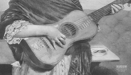 使い込まれたギター、どこか奔放な表情で歌うジプシー風の女性。後ろには皿とコインが見えます。