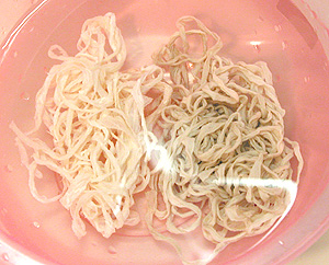 塩を軽く払って水洗いします。左の写真はさきに御紹介した羊腸Aです。右の写真は羊腸Tです。