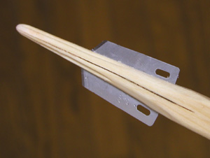 角材を写真のように糸鋸盤で切り出し、先端をとがらせて十字にスリットを入れます。