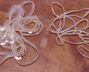 腸は蛋白質なので縒ったあとに乾かすと吸着しあって固まります。このとき脂分が無いにこしたことはないのです。