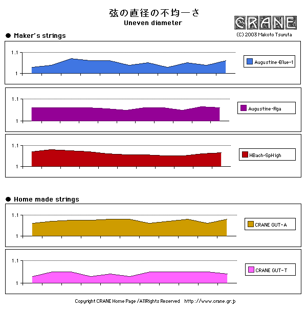 メーカー製の弦と比較しても私が今回作ったガット弦(AとT)は精度的にまったく遜色ないことがおわかりいただけるでしょう。