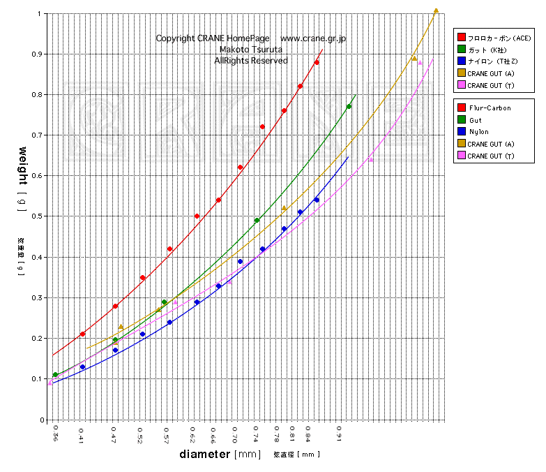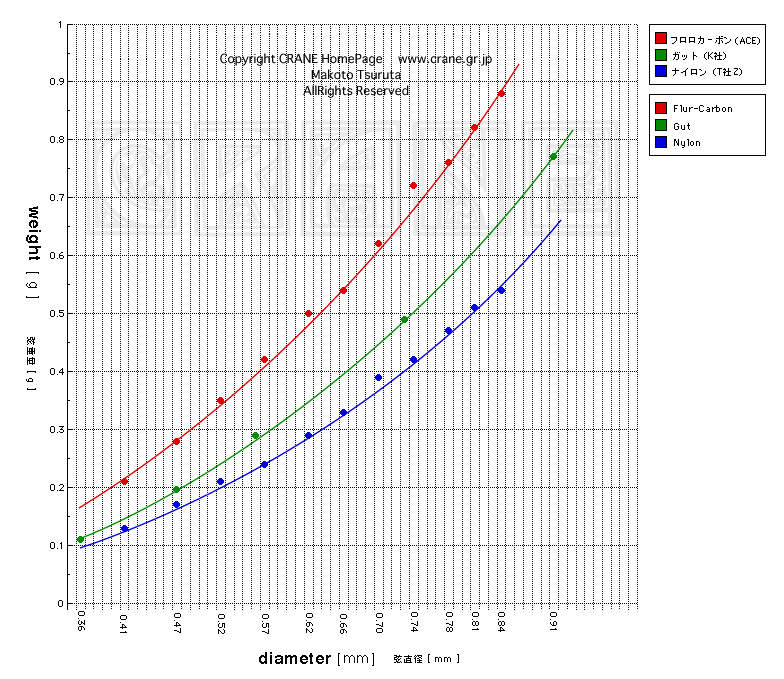 同じ太さであっても素材の種類(色分けして表示してあります)によって重さは異なるわけです。そうやってグラフを御覧ください。