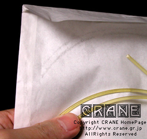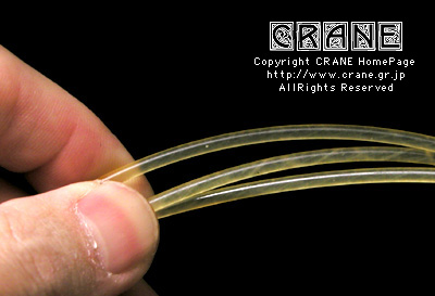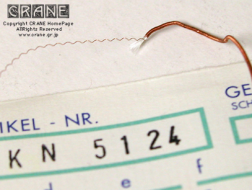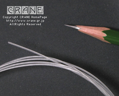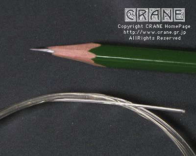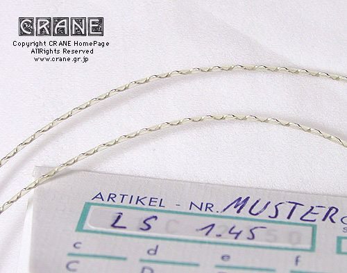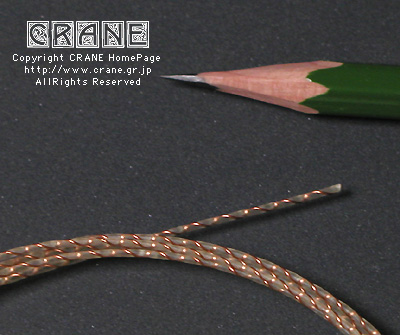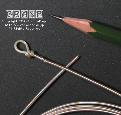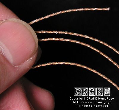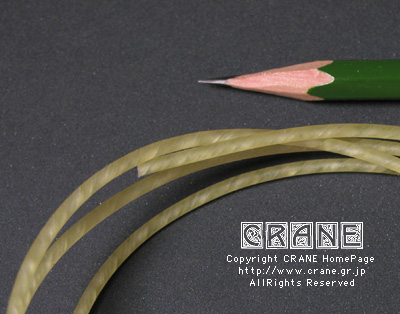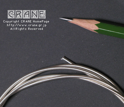 ● VN(Nylon/Kupfer-varsilbert) :キルシュナー社のVNです。もうCRANEを御覧の皆さんにはおなじみですね。但しVN5380といって異常に太いゲージです(笑)。私としてもガット弦を自作するからにはあれこれ資料として取り寄せてみたのですよ。芯材がナイロンで周囲に金属を巻いてあります。こんな太いゲージも製造できちゃうんですねぇ...... 。VNは表面の研磨指定もできます。