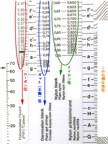 つまり次の図で示すように e' の音を6.5kgのテンションで張る場合の弦の選択肢は色分けしたように横並びで見ていけばよいのです(フロロカーボン、ガット、ナイロン、巻弦が横一列に表示してあるのがミソ)。カーボン弦なら直径約0.54mmを選び、ガット弦なら直径約0.61mmを選び、ナイロン弦なら直径約0.675mmを選べばよいのです。さらに右側には巻き弦のスケールがあるので、もしお店に弦が用意してあれば909AI という巻弦を張ることも可能というわけです(この写真には写っていませんが)。なお該当する弦が用意(市販)されていない場合はスケールを見比べてどれか近いものを選ぶことになります。この弦計算尺の右端はピラミッド社の巻弦の製品番号(型番)です。
