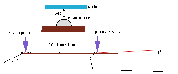 弦高を下げる方法については次のCで解説するとして、気になるネックの反り具合ですが、私の場合はナット〜12フレットのチェックと7フレット〜17フレットのチェックを行います。まずナット〜12フレットのチェックは次図のように1フレットを指で押さえ、もう片方の指で12フレットの右側(つまり13フレット)を押さえ、もう一本の指?で6フレット位置の弦高をチェックします。多くの場合は0.3mm〜0.7mm程度のようです。これがベッタリ密着していれば逆反り(あるいは1フレット〜12フレットが全体的に磨耗)の可能性が高い......逆にギャップが広すぎれば順反りの傾向があるというわけです。次に7フレット〜17フレットのチェックも同様ですが、7(場合によっては5)フレット位置を押さえて、18フレット位置を押さえ、そのときの12フレット位置のギャップをペシペシとかるくハンマリングしてチェックし、0.1mm〜0.2mm程度であることを確認します。現実には12フレット位置を境にして反ることがほとんどなので後者のチェックが現実的であります。まあ、弦長にもよりますし、1弦〜6弦各位置によってもギャップは異なります。というわけで上記のチェック法は(例外的な楽器もありますけど)目安にはなるでしょう。私の場合はなるべく現状を維持しつつ、フレットも個別に削って合わせていくことが多いです。フレットの切削はマスキングして弦はゆるめて外さずに作業します(このほうが調整がスピーディ)。