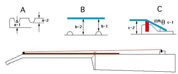 A(ナット):指板との高さを決定するa-1及び、弦が挟まる(埋まる)深さを決定するa-2の値。 B(フレット):フレットの先端部から弦までの高さb-1及び指板から弦までの高さb-2。このほかにもフレット同志の高さの比較やナット〜フレットあるいはフレット〜サドルの関係に注目します。 C(サドル):弦の固定部からサドル先端までの仰角c-1(シータと鶴田は勝手に命名)。そしてサドルの高さ(表面板から弦までの高さ)c-2。ほかにもブリッジの形状や弦の保持・固定方式は重要です。