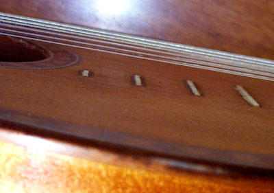 最後に19世紀のフラッシュボードタイプのギターで象牙フレットが見事に磨耗しきったナイスショットをご披露しましょう........。エクステンションの14フレット〜17フレットです、ここまで弾けばギターも本望でしょうなぁ.....。