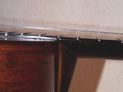 のフレットについてですが、現在市販されているフレットでその頭の部分の高さはギター用だと0.91mm〜1.39mm、マンドリン用のフレットで0.81mmなどがあります。つまりフレットの種類にっよってはギター用の場合で0.5mmも高さに差があるのです。部分的に打ち換えられたものが他のフレットと同じ形状であることは希で、結果としてヤスリで全体の高さをならすと、そのフレット位置のみで弦に接する面積の違いから奏者にとってはレスポンスとサスティーンがココだけなんだか変?ということもあるわけです(大げさに聴こえるかもしれませんが敏感なプレーヤにはわかるんだそうですよ)。古い楽器では一見して明らかにフレットのサイズ(太さ)が異なるものが同居していることはよく見かけます。