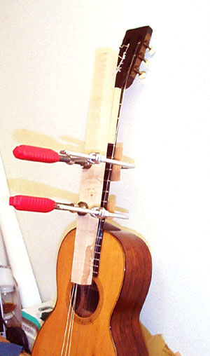 ネックの反りを戻す方法は? あります、あります。スチール弦の近代のギターやマンドリンはそのロッドスチュワートってヤツ(アジャスタブルロッド)をレンチで回すわけです(ここでは詳しく説明しません)。むしろ問題になるのはそのようなロッドが内蔵されていないタイプの楽器でありまして、リペアの文献を調べてみますと、たいていはクランプなどでベンドして加熱・放置(あるいはスチーム)という修正手段が一般的なようです。但しベンドは軽くでいいのです、締め上げてやろうなどとは決して考えてはイケマセン! 軽くやらないとバキッ!というニブイ音とともに悲劇を招くことになります....(経験者談)。ベンドしたまま放置しますが、はっきりいって元に戻っちゃうことが多いのです。ですから指板を剥がし、ネック自体をカンナでならして指板を再接着するのがいちばん良い方法ではないかと私は思います。ちなみにこのネックベンドによる修正法はみなさんは絶対マネしないでください、楽器を壊しますゾ....。指板を剥がすには「専用のヒーター」を使うのがベスト電器です、LMIなどで指板加熱用の専用ヒーターが売られています(高いけど)。ネックの反りをなおしてもジョイント角度が狂っていればネックのリセットということになります......これもまたいずれ紹介しましょう。