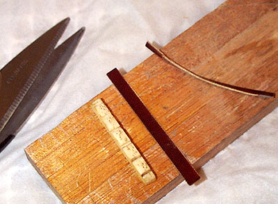あと、一時的な(応急的な)ナットの高さ調整としてはシム(市販されてる)を使ってリフトしたり、テレホンカードで短冊を作って同様に調整することも可能です。もしあなたがナットを自分で作るなら、今まであったナットにこの処置を行って高さを決定し、そのあとで参考にしながら新しく買ったナットブランクを加工すればいいでしょう。ちなみに鶴田はこのシムはゴツいハサミでバリバリ切りながらサイズを合わせ、ヤスリで仕上げます。