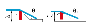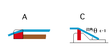 のサドルについて.........これが厄介なんだな。みなさんの周りで、ど〜〜〜もギターが弾きづらい......なんて話を耳にしませんか? 私がそんなことをツブヤクと「そんなの練習不足じゃ!」と笑われそうですが職業人プレーヤにとっては弾きやすさはトッテモ大事な楽器の条件であります。音量や音色はもちろんですが弦高・テンション・調弦のしやすさ・プリングオフやスライドの操作感・セーハやポジション移動の具合.....私たちトーシロでも気になることがプロにとっては本番で「フレットの調子が悪くて...」などと言い訳にはできないでしょうしね....。次図のようにc-2の高さ(弦高)は楽器のタイプによって様々です。そりゃまあ、サドルを削って調整しますがどうせならオリジナルには手をつけず新たにサドルを買ってきて行うほうがいいでしょう。私のバヤイはサドルが弦に接する部分の角度の調整は弦がどのように固定されているかによってその仰角をうかがいつつ作業することにしています。一般的なクラシックギターと19世紀ギターやスチール弦ギターのピンを使う方法、あるいはアーチトップやマンドリンのようにテールピースを使う方法などがありますがいずれにせよサドルに接する角度は接触面の状態とその弦高とのバランスを見ながらの調整作業になるわけです。単純に弦高を低くすれば仰角シータは浅くなり、弦を表面板に押しつける力は減少し、テンションは下がり、サスティンに影響が出る...というのが一般的な傾向のようです。削り具合によってはサドル位置からノイズを発生し、それが改善されるまでひたすら調整を繰り返す....楽器にもよりますし、限界まで弦高を下げるにはいくつかのリスクが伴うようです。弦高を下げて起こる各種の症状はテンション低下が起因するものと私は感じています。