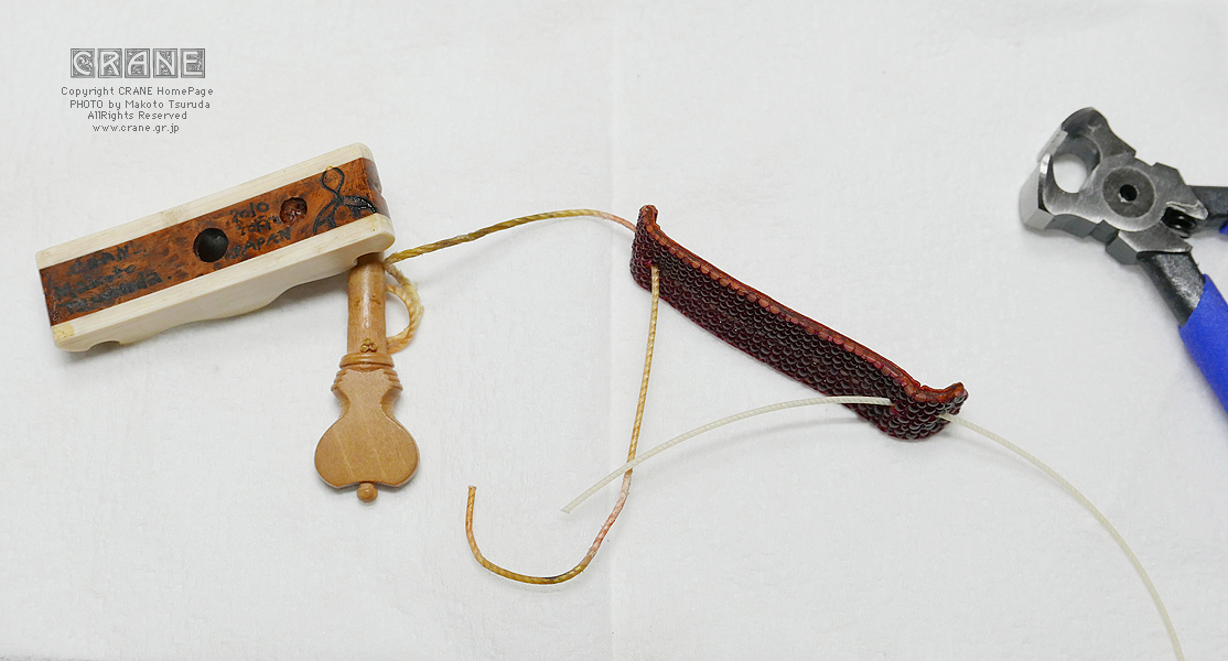 このモデルはヒモにロープガット(羊腸)を使った特別仕様。編んだガットなので値段もお高いのですよ。