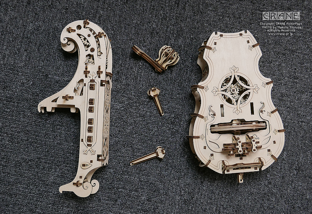 動画3:5分21秒 説明なしでBGMのみ. UGears Hurdy-Gurdy lasercut kit timelapse by Michel Stuyts