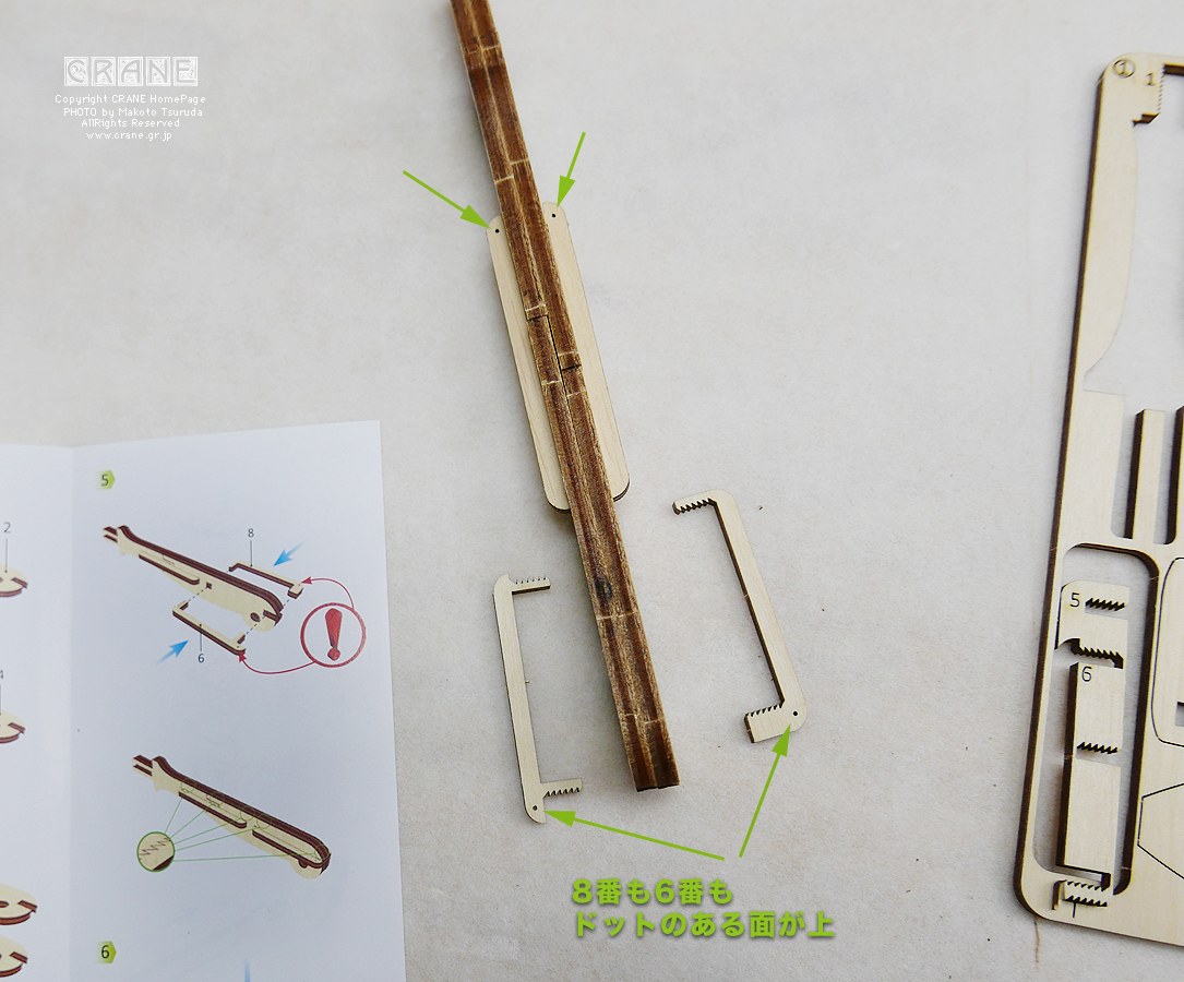 (4)同様に 8番と6番 の部品を取り出して柄に組み込みます。これもドットのある面に注意してください。