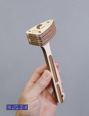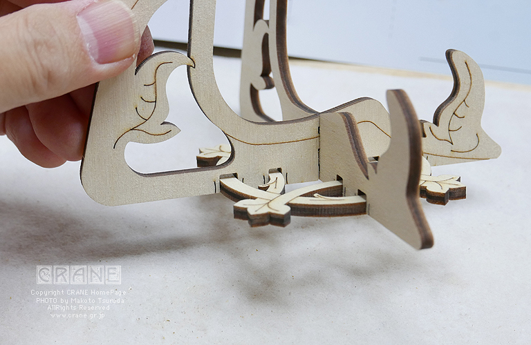 丸い軸受部品に + の穴が開いた部品がよく登場します(薩摩藩パーツですな)。これらはレーザーで正確にカットされているのですが、木材の収縮とレーザー熱等でわずかな変形があります。そのため、いったん十字の軸に入れようとしてキツイ場合は無理に入れると割れます(ロウを塗っても割れることがある)。そんなときはいったん抜いて90度または180度向きを変えて挿してみましょう。