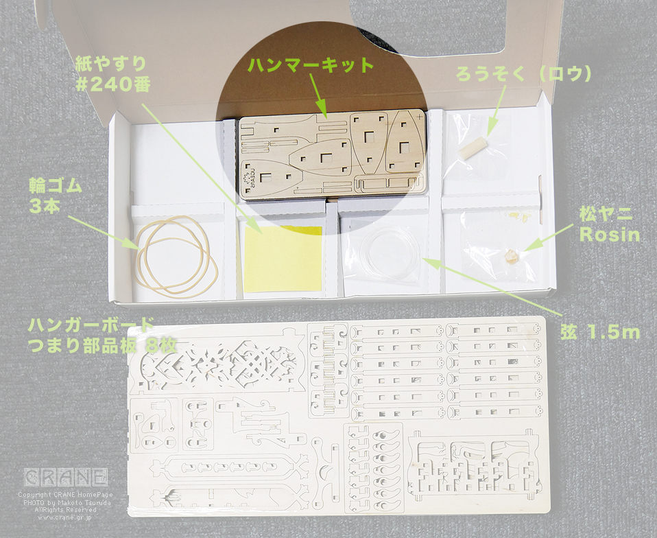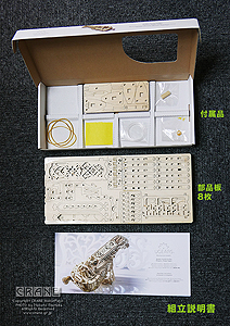 シナベニヤの合板をレーザーカットした部品が8枚です(各部品はハンガーボードと呼ばれる部品板にしがみついている状態)。付属品と組立説明書の冊子。じつにコンパクトです。