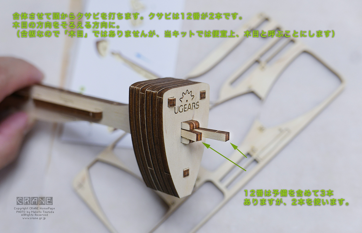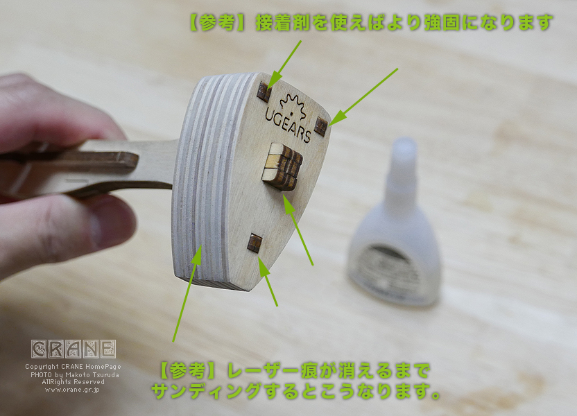 このキットでは接着剤を使わないのがウリでもあります。PL法のような安全上の問題もあるのでしょう。しかし、弦楽器製作家の視点からみると強度を確保しておきたい部分も見られます。あとで修理することも想定しつつ、私は部分的に接着剤も使いました。分解する予定のない箇所は接着剤を使う、というふうに考えると良いと思います。逆にいえばあとで修理や調整で分解する可能性のある箇所は接着しないということです。また、回転部分を接着してはいけませんので、慎重に。