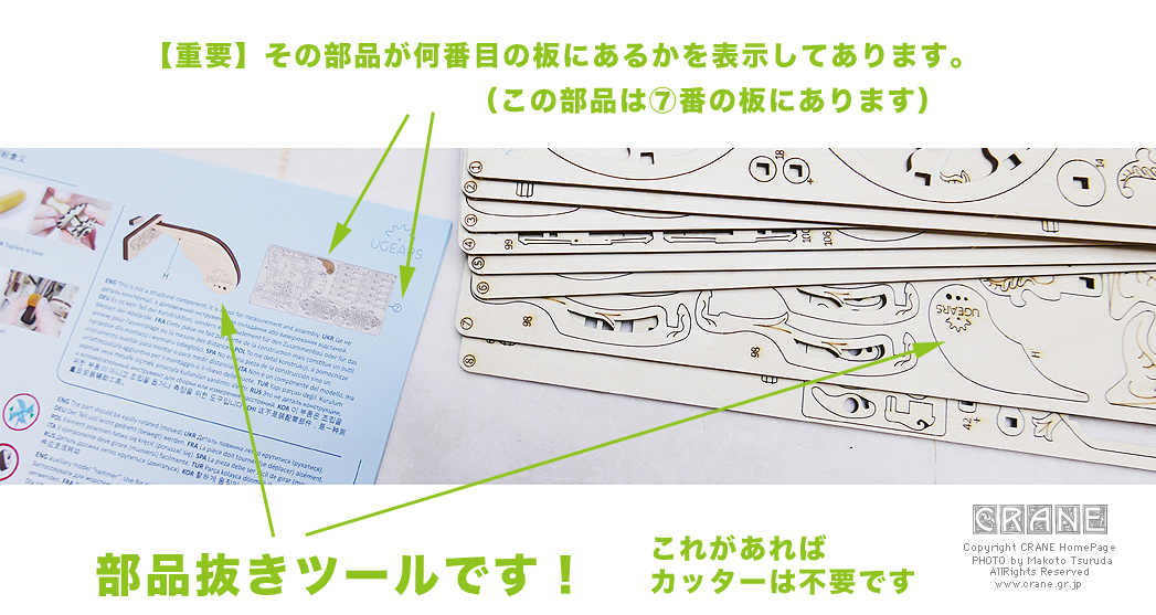 なお、このキットでは行程ごとに使う部品が何枚目(何番目)の板にあるかを表示してあります。